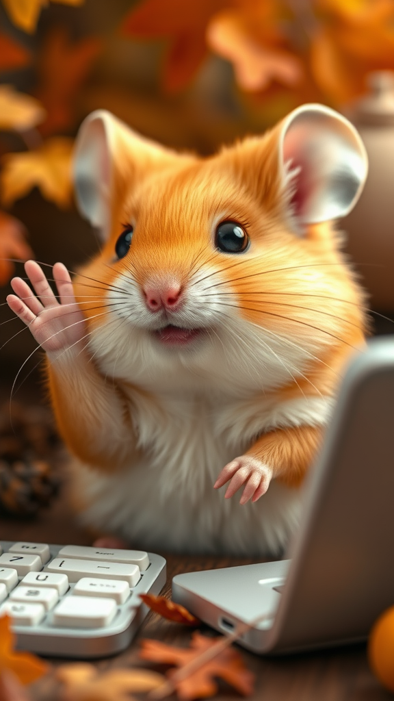 Charming and enchanting portrait of an irresistibly cute golden hamster, waving farewell with one tiny paw as it types a blog entry, smooth and flawless face, infused with the whimsical essence of character design by Mark Ryden, Pixar, and Hayao Miyazaki, sharply focused, concept art. Embellished with the rich, warm tones of a harvest autumn vibrancy, this piece showcases intricate detail and cinematic lighting, achieving a hyperrealistic effect. Captured with the precision of 3.5mm diorama macro photography, this artwork radiates an 8k, 4k brilliance, creating a truly captivating visual experience.