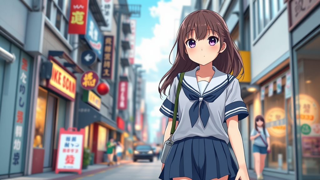 Charming anime girl strolling along a bustling street in a classic school uniform, rendered in smooth, high-quality anime CG style, capturing the essence of a cute and captivating high school girl; embodies a realistic anime 3D visual, with vibrant and lifelike details; evokes the feel of a key visual from a visual novel, with a focus on youthful energy and enchanting charm; crafted in an anime artist's studio, resulting in a beautifully realistic depiction of a schoolgirl, perfect for a vivid and immersive anime art scene.