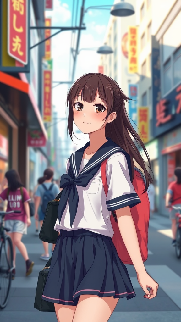 Charming anime schoolgirl strolling along a busy city street, her school uniform perfectly capturing her vibrant youth, rendered in a smooth 3D anime art style, showcasing an enchanting and realistic depiction. Her expression exudes a mix of serene confidence and subtle curiosity, typical of a visual novel protagonist. The scene captures the essence of a vibrant day, painted with exquisite detail in an anime painter's studio, where light and shadow play across the scene, enhancing the youthful beauty of this realistic anime art piece.