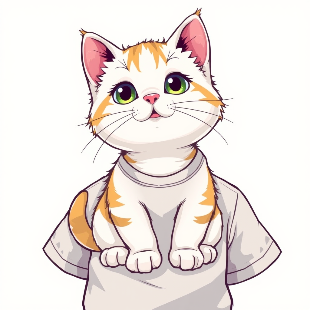 Charming anime-style vector of a cute kitten on a T-shirt, illustrated by Tim White, featuring delightful and vibrant colors, against a soft pastel background, adorable and clean design, maintaining an overall raw aesthetic with a touch of creativity.