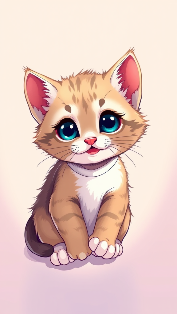 Charming anime-style vector of an adorable kitten on a T-shirt, illustrated by Tim White, featuring vivid colors. The kitten is playful and cute against a soft, light background, capturing a whimsical and heartwarming essence with a 1:1 aspect ratio and raw artistic style.