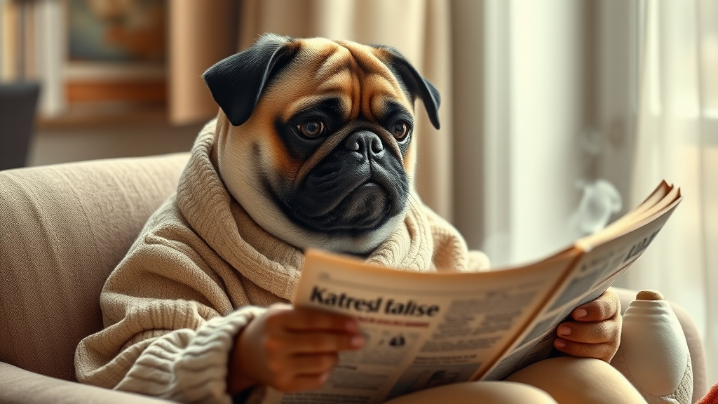 Charming anthropomorphic pug dog leisurely enjoying breakfast in a cozy robe, engrossed in a newspaper, set in a lightroom environment with a cinematic touch; the scene is captured in HDR with a raw, high-quality finish, featuring intricate details and soothing tones against a low contrast backdrop. A steaming cup of coffee beside him adds warmth to the serene morning ritual.