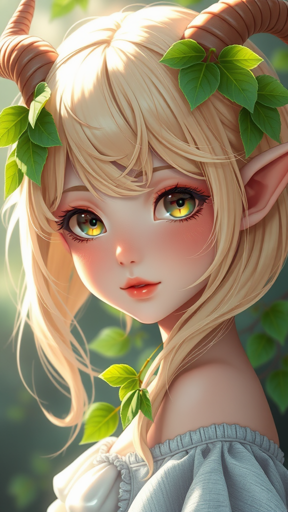 Charming blond-haired girl with delicate horns adorned with vibrant green leaves, rendered in exquisite digital anime art. Drawing inspiration from the styles of Loish, WLOP, and Guweiz, this enchanting elf-like character is depicted in an adorable and hyper-detailed digital painting. Her ethereal presence evokes a fantasy world where charm meets intricacy, capturing the essence of anime-styled 3D art. She stands out as a mesmerizing figure, combining elements of fantasy and elegance, perfect for fans of digital anime illustrations.