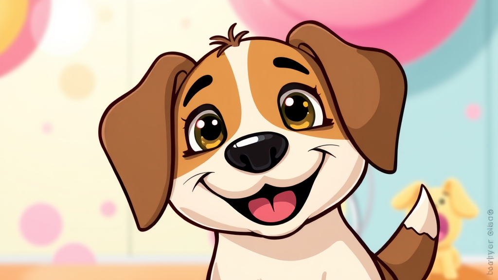 Charming cartoon-style illustration of an adorable dog joyfully looking at the viewer, its eyes twinkling with happiness and mouth slightly open in an endearing smile, set against a vibrant and playful background.