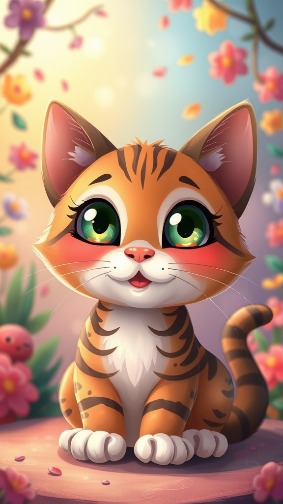 Charming cat illustration for a children's storybook in the style of Tarsila do Amaral, UHD, HDR, 8K, featuring a playful feline with colorful and whimsical features, large expressive eyes full of wonder, surrounded by a vibrant and enchanting background, ensuring a joyful and engaging scene without distortions or imperfections, maintaining visual harmony and coherence throughout, with a polished and clear presentation free from any unwanted elements or distractions.