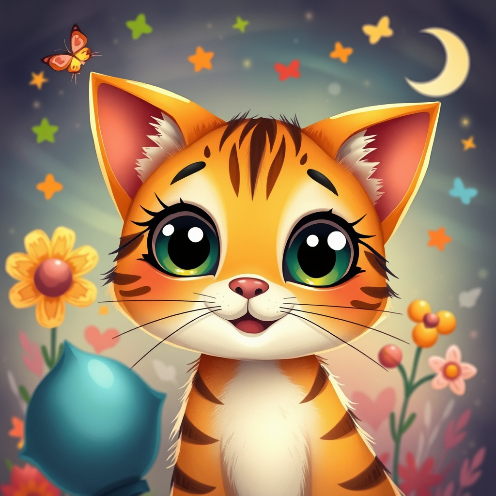 Charming cat illustration with a whimsical and playful style reminiscent of Tarsila do Amaral, designed for a children's storybook, in vibrant UHD, HDR, 8K quality. The illustration features a delightful and endearing cat with oversized, curious eyes and a joyful expression. The composition is filled with colorful elements that evoke a sense of wonder and imagination, ensuring an engaging visual experience for kids. While maintaining artistic integrity, the artwork avoids elements of distortion, poor alignment, or low resolution, ensuring the focus is on captivating charm and clear, vibrant imagery, free from distractions like watermarks or text overlays.