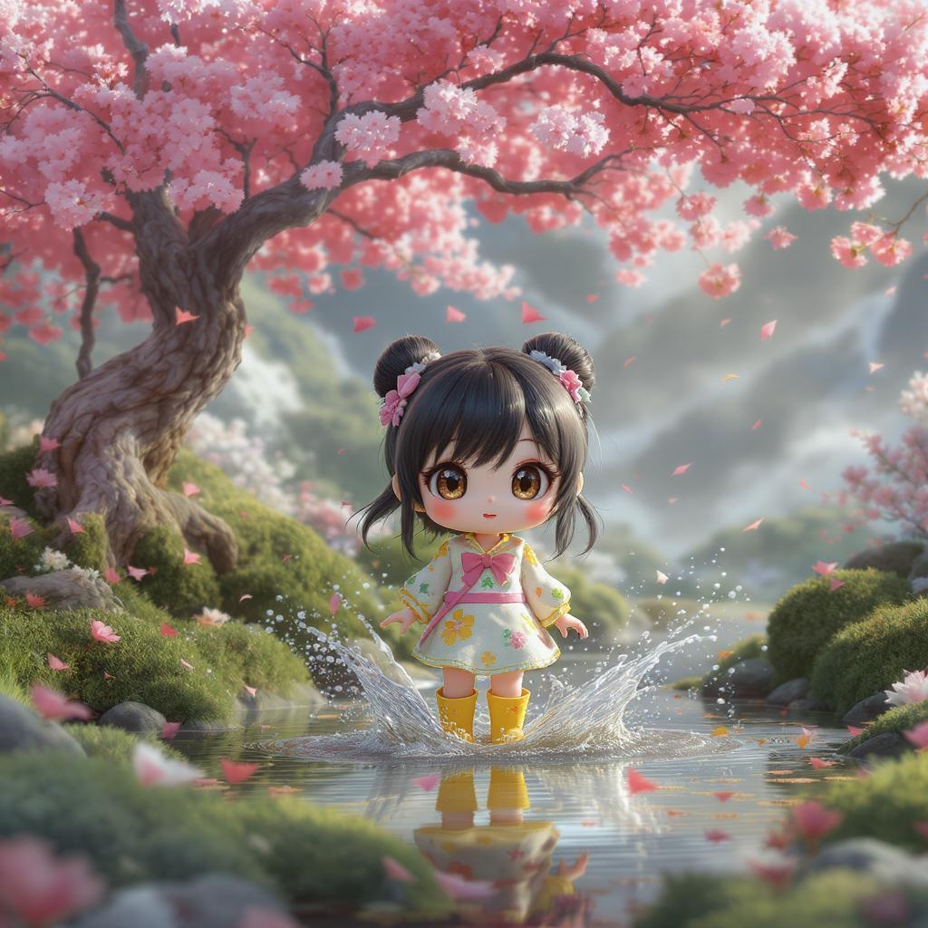 Charming character design 3D octane render, wide shot, adorable chibi style small girl doll splashes in a puddle, enchanting landscape, beneath a flowering cherry blossom tree, bright yellow rain boots, oversized expressive eyes, prize-worthy, hyper-detailed, octane render, soft volumetric lighting, intricately detailed background, --ar 9:16 --s 1000.