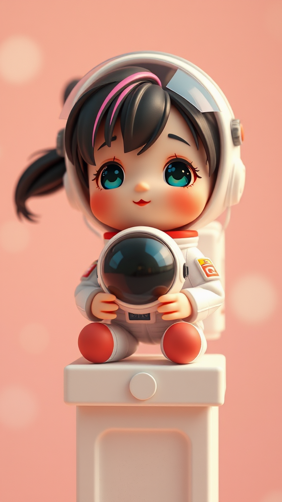 Charming doll with a small helmet, vibrant 3D art, adorable and intricate digital design, young female adventurer, delightful digital painting, stylized 3D representation, cute digital illustration, charming 3D anime girl, tiny astronaut gazing upwards, endearing! C4D, portrait of anime space cadet girl, perched on a white platform.