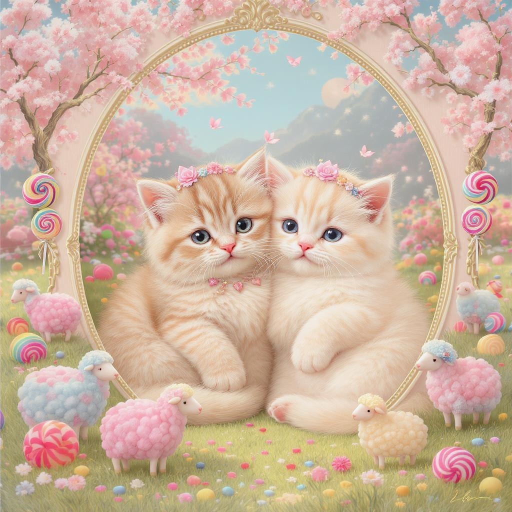 Charming duo of fluffy kittens nestled side by side, brought to life in a pastel palette reminiscent of Christen Kobke’s delicacy, showcased in rococo style. Surrounding them, a whimsical landscape unfolds where rainbow-colored sheep, soft as cotton candy, roam, crafted from shimmering candy and vibrant lollipops.