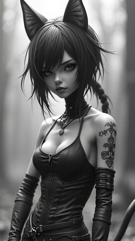 Charming feline-inspired girl, created with influences from Yoji Shinkawa and Guweiz, in the distinctive style of Borderlands using Unreal Engine and Octane Render. Rendered in 8k UHD with raytracing and cinematic lighting, incorporating depth of field effects. The piece exhibits a monochrome finish with grayscale tones. The composition includes intentional elements like distorted frame borders, random text, logos, and watermarks that blend into the artwork's aesthetic. Features a mix of quality levels, with some areas appearing deliberately low resolution or slightly blurry to create a stylized appearance. Anatomy is exaggerated, with elongated neck and limbs, occasionally showing creative alterations in hand and finger portrayal, all contributing to a whimsical, otherworldly feel. The overall composition maintains an artistic balance while exploring unconventional anatomy and blending various artistic styles.