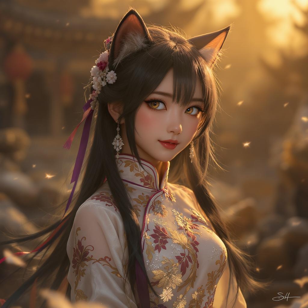 Charming feline-inspired girl donned in an intricately designed traditional Chinese qipao, with delicate, embroidered patterns, exuding elegance. Her cat-like ears peek playfully from her stylishly arranged hair, softly reflecting the warm, cinematic lighting that bathes the scene in a gentle glow. Her eyes, bright and expressive, capture attention as they shimmer with a hint of mystery. The atmosphere is both enchanting and ethereal, with a backdrop that subtly hints at an ancient, mystical world, evoking a sense of adventure and wonder.