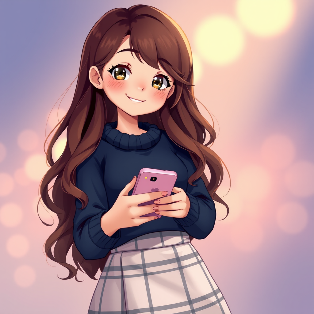 Charming girl with a friendly smile, holding a smartphone, dressed in a cozy dark blue sweater and a checkered midi skirt, her long wavy chestnut hair cascading down, surrounded by a soft glowing background, 8k digital artwork, vibrant colors and intricate details.