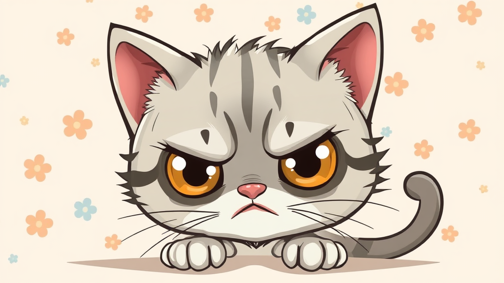 Charming illustration of a grumpy kitten with big eyes glaring directly at the viewer, cartoon style, with playful patterns and soft pastel colors in the background.