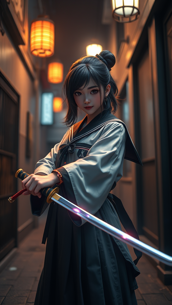 Charming Japanese female sophomore in traditional school uniform wielding a shimmering katana, standing confidently in an atmospheric dimly lit alley, cinematic ambiance, 3D render utilizing the power of unreal engine, ultra-high resolution 32k, set in 9:16 aspect ratio, crafted with an expressive and dynamic style, vibrant yet mysterious scene.