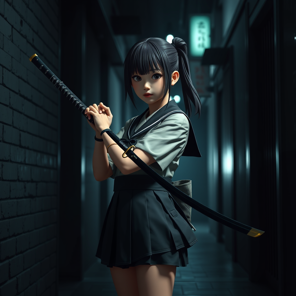 Charming Japanese high school girl in a traditional school uniform wielding a sleek katana, standing confidently in a dimly lit alleyway. The scene is rendered in cinematic quality, utilizing 3D technology, with exceptional detail at 32k resolution. The atmosphere is enhanced with an expressive and stylized approach, captured in a vertical 9:16 aspect ratio using the latest Unreal Engine. The surrounding shadows and subtle light play create a dramatic yet enchanting vibe, emphasizing her poised and determined expression.