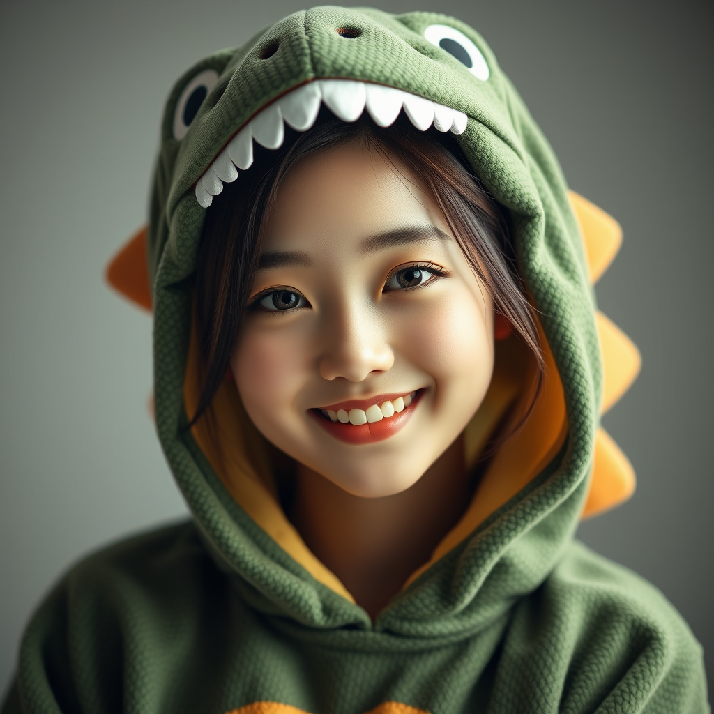Charming K-pop idol in an adorable dinosaur costume, her smile radiant and face clearly visible, portrayed in a close-up shot using a Sony a1 camera, 85mm lens at F/1.4, ISO 100. The photograph captures the essence of elegance, taken with medium format and 45 megapixels. Studio lighting with softbox and high shutter speed flash enhance the image, resulting in an award-winning composition following the golden ratio. The artwork is influenced by CGI and 3D artistry, with elements of doll-like features, octane rendering, and a blend of cartoon, anime, illustration, and digital painting styles. Emphasizing quality and aesthetics, the image avoids any low-resolution errors, text, or technical flaws, maintaining integrity and exquisite attention to detail.