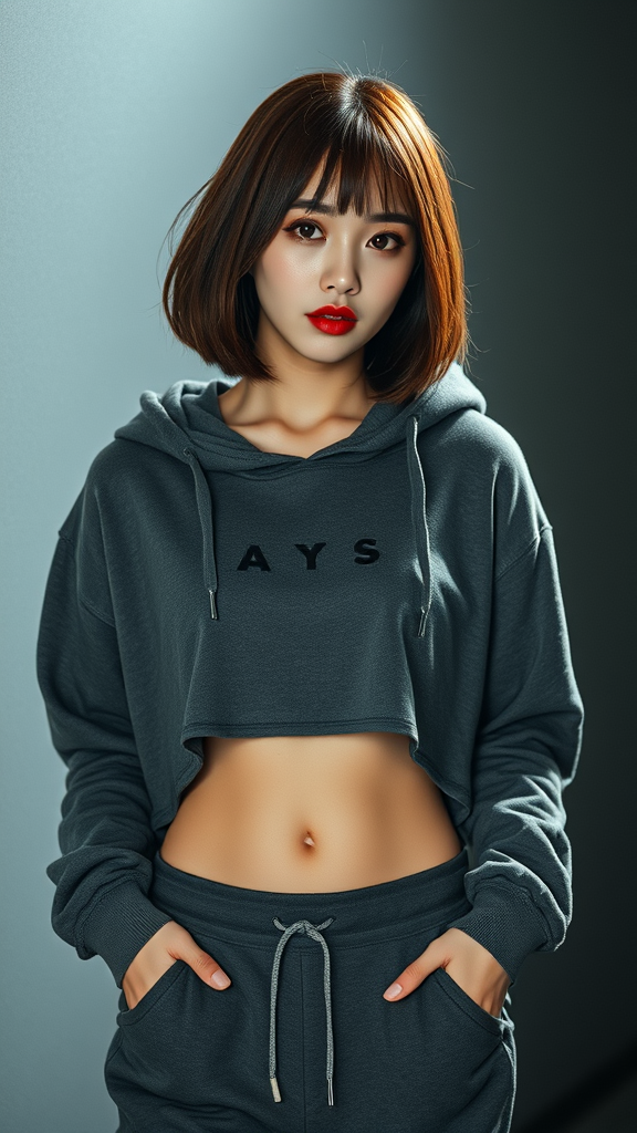 Charming Korean girl with a stylish loose bob haircut, dressed in a trendy cropped hoodie and chic capri sweatpants, hands casually resting in her pockets. Her lips, painted a bold red, contrast with her delicate features, including bright eyes framed by long lashes and subtle aegyo sal. Her athletic figure is accentuated by her toned stomach. Captured in dramatic lighting that skillfully highlights her alluring aura, this scene feels like a moment frozen in time, revealing beauty and contemporary fashion.