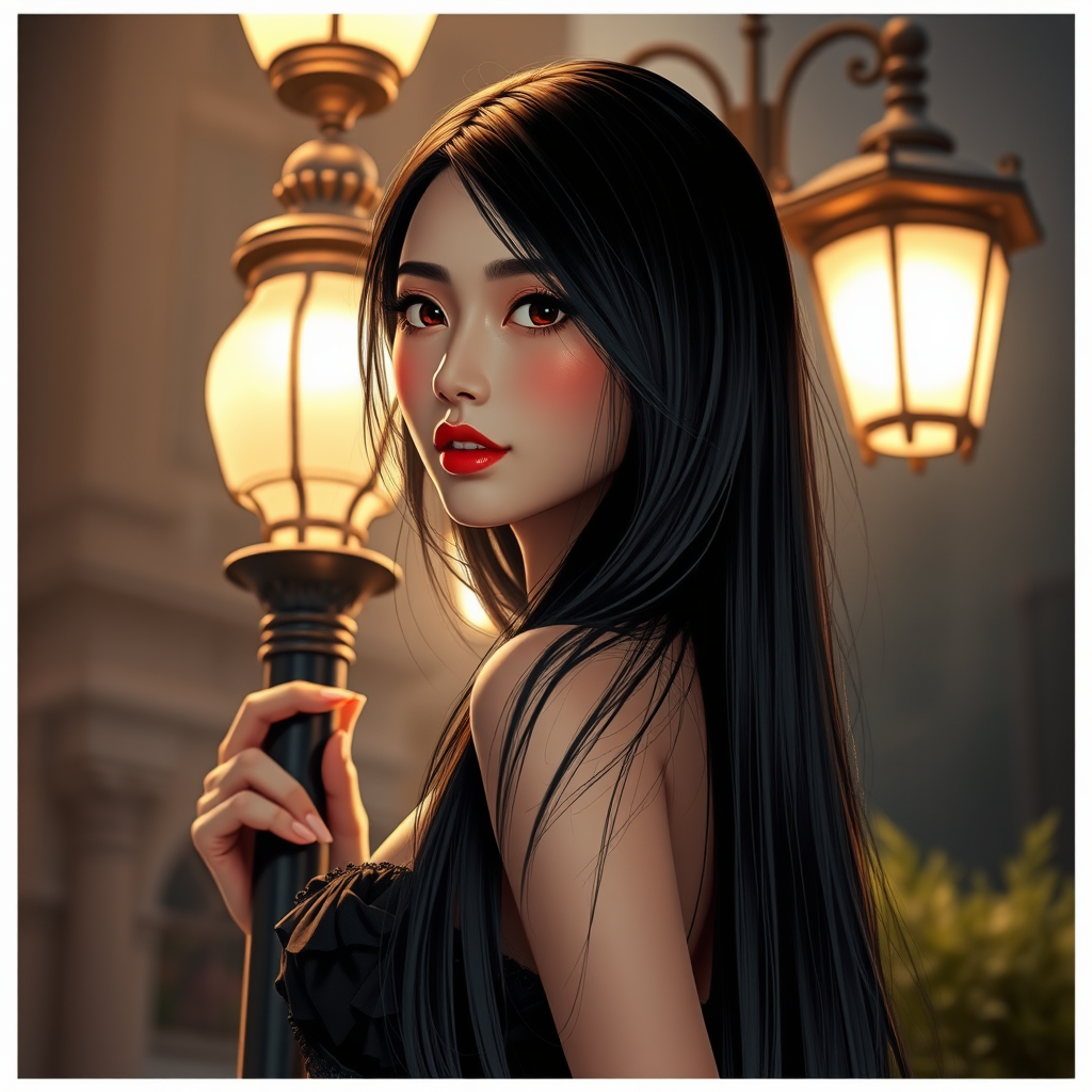 Charming lady with a striking face, cascading long black hair, tall and slender silhouette, gracefully poised beneath a vintage lamppost, intricately detailed, Anime-inspired, Glamorous portrait, stunning illumination, octane-rendered elegance, exceptionally detailed, ultra-realistic, cinematic allure, dramatic and volumetric lighting, captured with a 150mm lens, lifelike and photorealistic, with no denoise, inspired by Artstation aesthetics, avoiding poor anatomy, ensuring clarity without blur, maintaining natural proportions and framing, unique features with no cloned or distorted elements.
