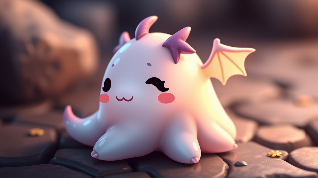 Charming little dungeon slime with a playful demeanor, adorned with tiny dragon wings and a whimsical chibi face, exhibiting a soft glow and pastel colors that add to its endearing appearance.