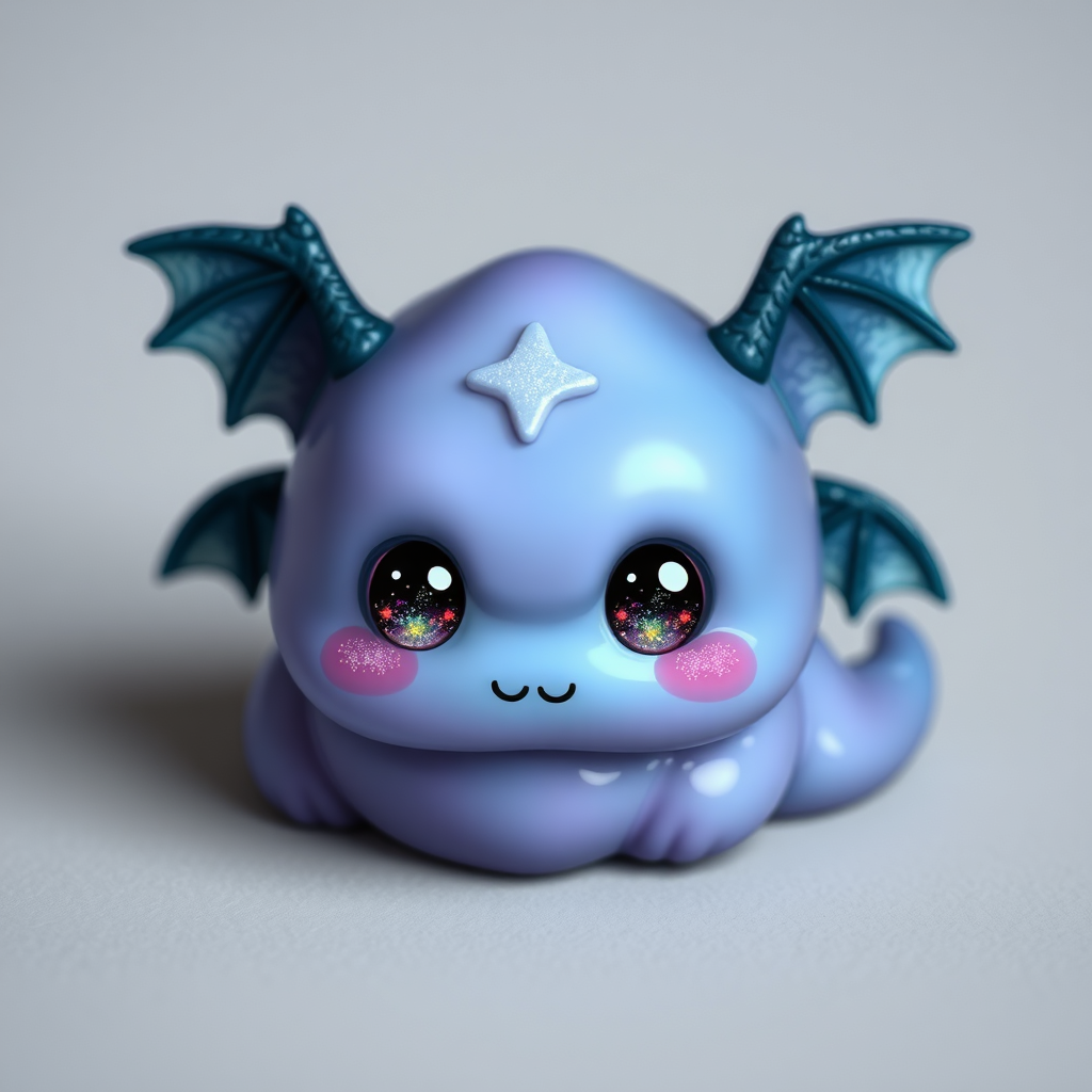 Charming miniature dungeon slime with sparkly eyes and a playful demeanor, featuring tiny dragon wings and a soft, chibi-like texture.