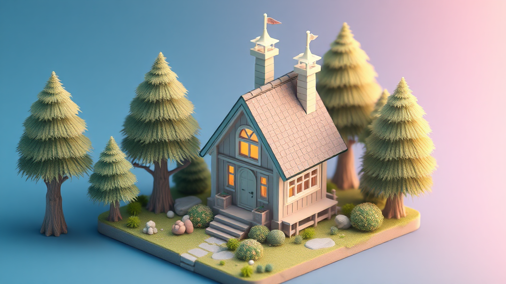 Charming miniature isometric fantasy cottage nestled in the forest, adorned with intricate details, featuring gentle, smooth lighting and a pastel color palette, captured through a 100mm lens, rendered in 3D with Blender, popular on polycount. The structure embodies modular constructivism against a blue backdrop, utilizing physically based rendering. Positioned centrally, it showcases volumetric lighting in a whimsical, cartoon-style with anime influences, while incorporating sketch-like elements, all in low resolution with standard quality.