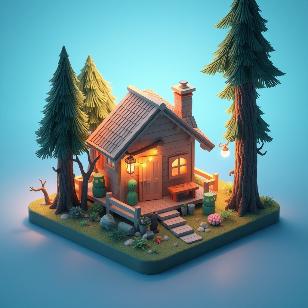 Charming petite isometric fantasy cabin nestled in the forest, adorned with intricate decorations, enveloped in gentle lighting, featuring pastel hues, captured with a 100mm lens. A 3D Blender render, gaining traction on Polycount, reflects modular constructivist influences against a serene blue backdrop. Emphasizing physically based rendering, the composition is centered and showcases volumetric atmospheric light in a cartoon-anime blend with sketch-like qualities, maintaining a low-resolution, casual aesthetic.