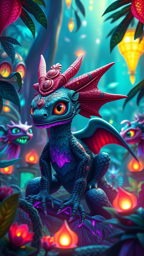 Charming Quetzalcoatl as a small, feathered dragon with adorable eyes amidst a bioluminescent jungle brimming with fantasy creatures and vibrant life. Enchanted world with intricate details, neon diffuse glow, shimmering iridescent colors, and echoes of Aztec civilization. Captivating octane render with subtle creative twists.