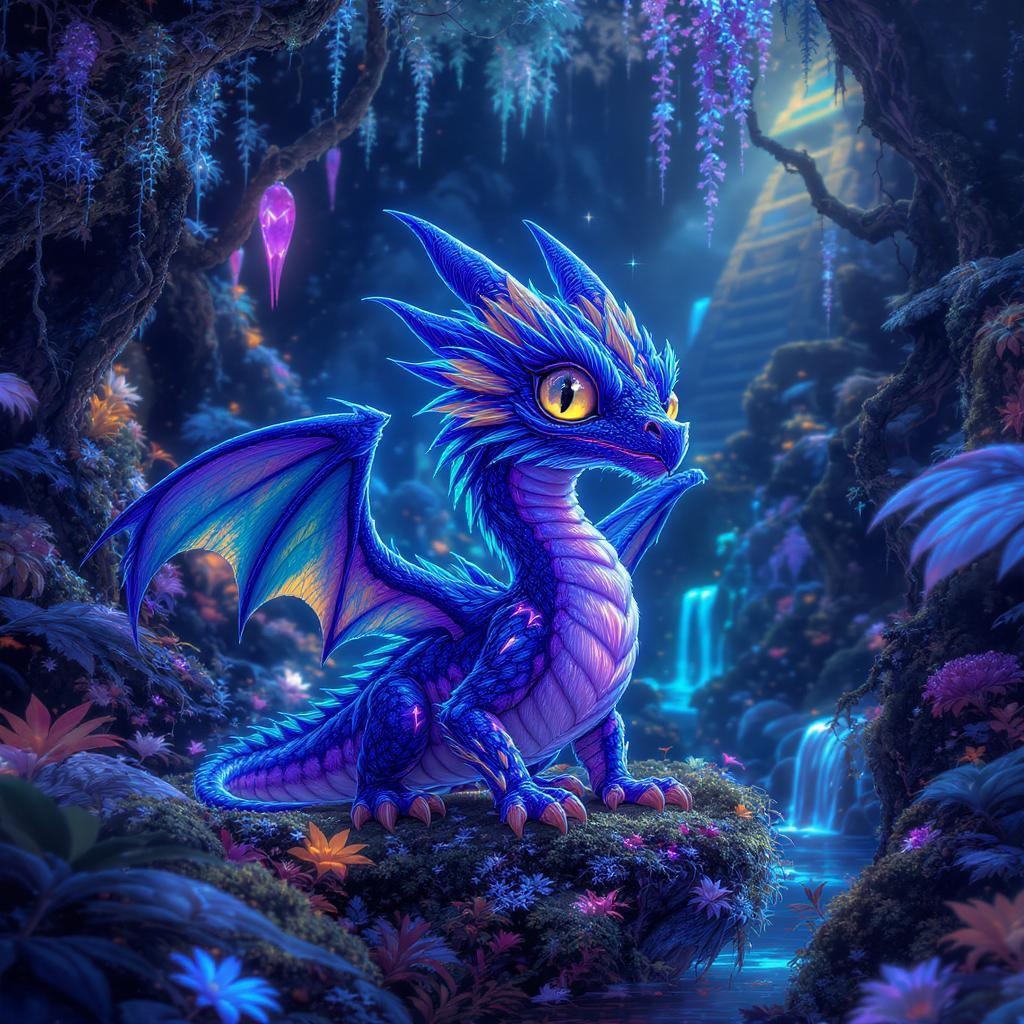 Charming small feathered Quetzalcoatl dragon with adorable eyes nestled in a bio-luminescent jungle teeming with fantasy creatures and vibrant life; a fantastical world where intricate details meet a neon diffuse glow, featuring iridescent colors and an Aztec civilization backdrop; rendered in a stunning octane style with a captivating uplight effect.