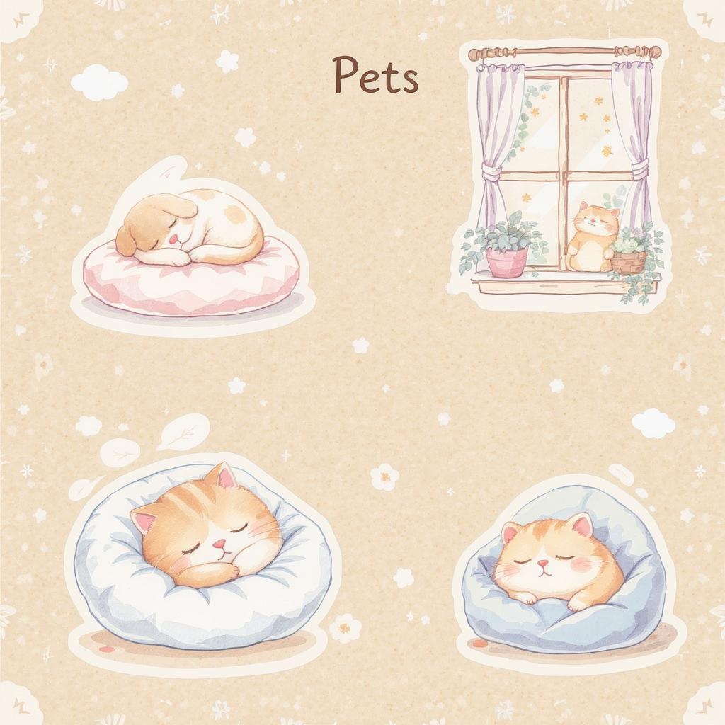 Charming UI design with whimsical illustrations of cute pets snoozing peacefully, evoking a sense of relaxation and mindfulness, rendered in watercolor style with a soft pastel color palette, set against a soothing khaki background.