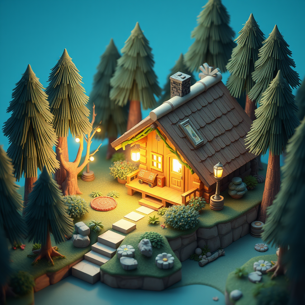 Charming whimsical isometric fantasy cabin nestled in a lush forest, detailed decoration, gentle ambient lighting, pastel hues, crafted using Blender with a 100mm lens, gaining popularity on Polycount, featuring modular constructivism, serene blue backdrop, realistic rendering, perfectly centered, volumetric light effects, blending cartoon and anime styles, artistic sketches, low resolution, standard quality, creating a cozy and enchanting atmosphere.