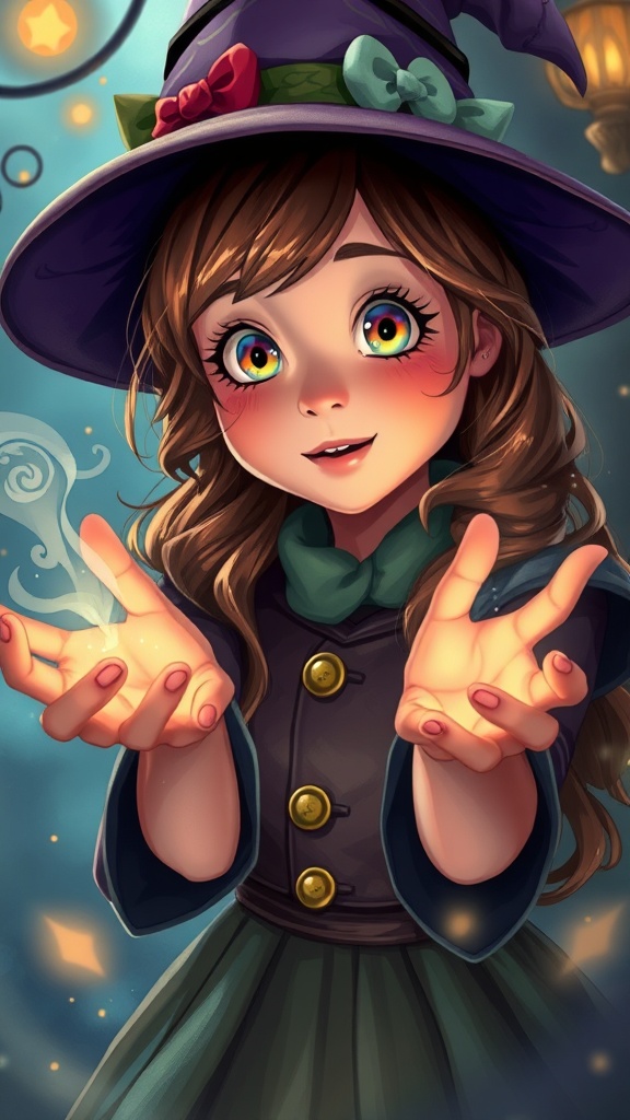 Charming young witch casting a magical spell, adorable expression, wide-eyed surprise, whimsical atmosphere, vibrant colors, playful magic swirling around her, enchanting scene, delicate hands with perfect proportions, intricate details, in a dreamy and fantastical setting.