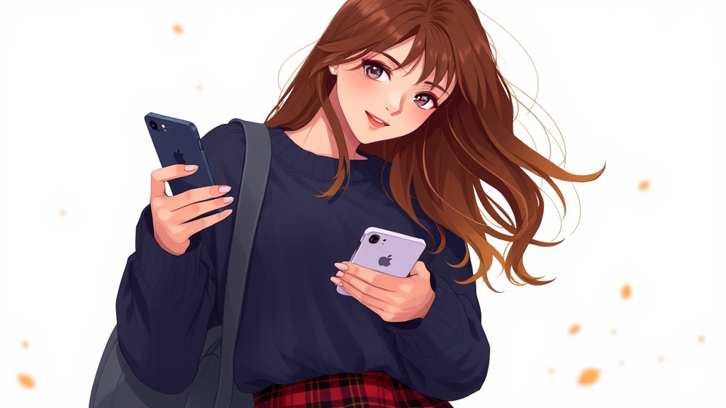 Charming young woman holding a smartphone, dressed in a cozy dark sweater and plaid mini skirt, with flowing chestnut hair, 8k resolution, digital illustration, digital art, subtle autumnal background accents.