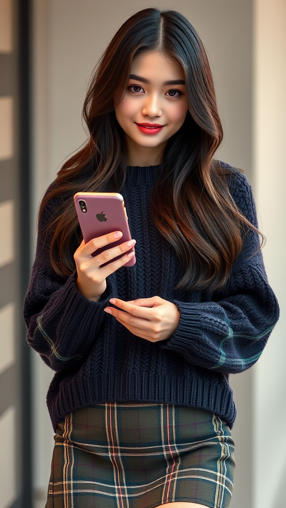 Charming young woman with a smartphone, dressed in a cozy, dark knit sweater and a plaid mini skirt, her cascading long dark brown hair framing her face, incredibly detailed digital artwork in vibrant 8k resolution.