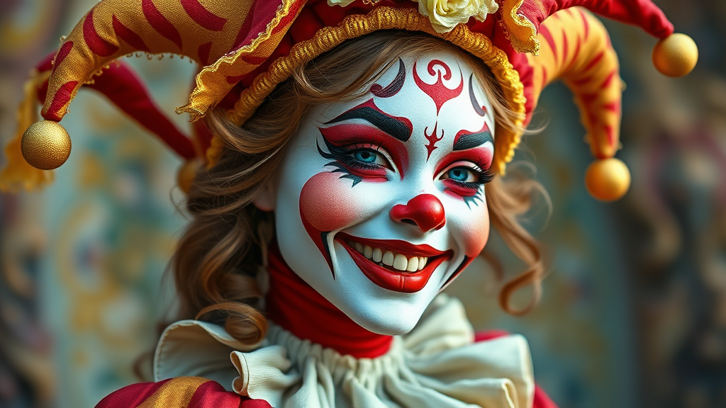 Cheerful harlequin clown girl, joyful expression, charming and endearing, dressed in vibrant Venetian carnival attire, captured in high-resolution hyper-realistic detail, reminiscent of a beautiful painting by Daniel F Gerhartz, full body portrait showcasing her grace and whimsy.