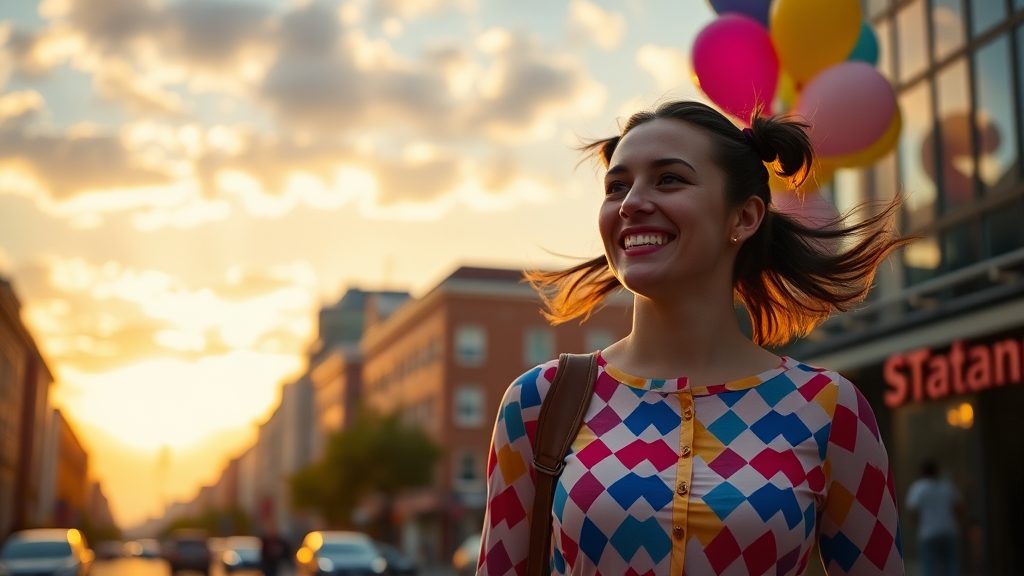 Cheerful woman dressed in a vibrant harlequin-patterned outfit, her pigtails bouncing joyfully as she strolls through the bustling city streets during a picturesque sunset, her infectious smile lighting up the scene. Volumetric lighting casts a warm glow over the scene, enhancing the playful atmosphere as brightly colored balloons drift gently in the backdrop against a partly cloudy sky. Shot with a side view camera on Kodak Portra 800 film, capturing the whimsical essence with a nostalgic touch.
