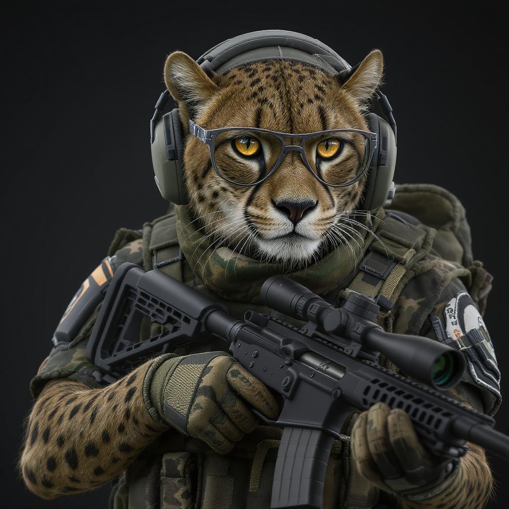 View this AI-generated image featuring an intelligent cheetah outfitted with camouflage and advanced sniper equipment gripping a precision rifle with human like characteristics showcasing intricate detail in ultra high definition a lifelike portrayal capturing every facial nuance set against cinemat