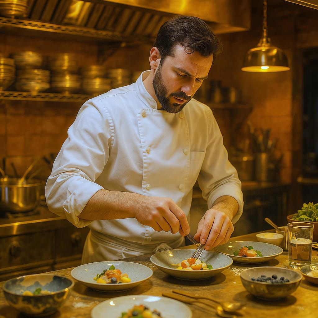 An expert chef in a pristine white uniform, fervently creating culinary masterpieces in a vibrant kitchen adorned with brass details, bathed in gentle amber lighting, reminiscent of Paul Hedley's artistic style. The scene is filled with the rhythm of a busy kitchen, as the chef's skilled hands move with precision, against a backdrop of harmoniously arranged ingredients and artful plating, capturing a timeless moment of gastronomic passion.