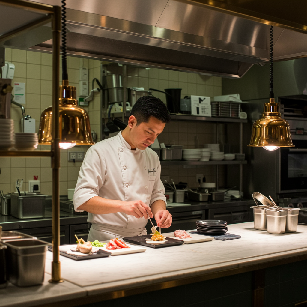 An experienced chef in a pristine white uniform meticulously creating culinary masterpieces in a vibrant kitchen adorned with brass accents, enveloped in gentle, warm lighting, reminiscent of Paul Hedley's style, exuding an atmosphere of refined artistry and dedication.