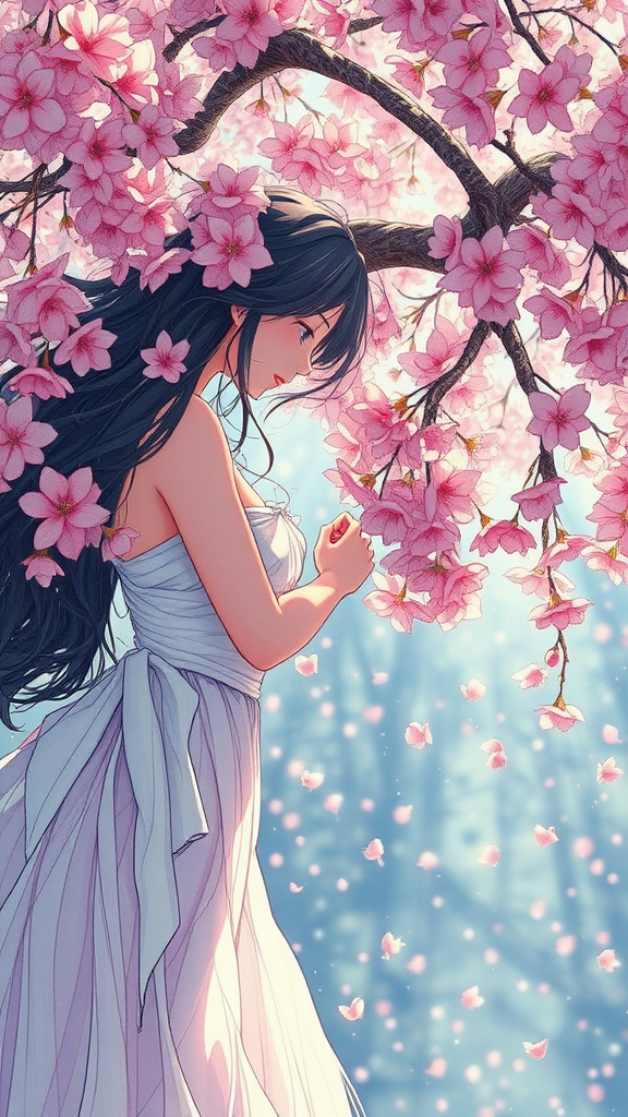 Cherry blossoms cascade gently to the earth, embodying the ephemeral beauty of spring. This scene captures a dynamic pose, centered with intricate and highly detailed line work. The breathtaking allure is accentuated by vibrant colors and a cinematic feel, drawing inspiration from artists like Carne Griffiths, Conrad Roset, and Anna Dittmann. The atmosphere is enriched with dappled sunlight, lending a magical touch to the setting.