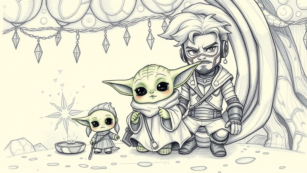 Chibi Baby Yoda in a whimsical fantasy setting, with a dreamlike atmosphere and surreal elements; the scene is super cute and intricate, reminiscent of popular trending art on ArtStation. The pencil sketch combines elements of a cartoon and anime style, featuring a quirky ensemble of characters, including a whimsical woman and a quirky man who have superhero elements akin to Iron Man; a tiny anime-inspired baby accompanies them on their adventure.