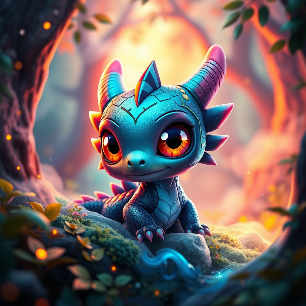 Chibi big-eyed dragon nestled in a vibrant forest, complete character concept, glowing with iridescent hues, using a trending color palette seen on ArtStation, matte painting style with animation lighting, showcasing depth of field. Highly detailed render crafted in Blender, resembling --ar 9:16 --q 2 --s 300 --v 5, inspired by Midjourney. Features turbulent fluid, fractal, smokey elements, maintaining symmetry and sharp focus, enhanced with vibrant colors and volumetric fog. Studio lighting effects with depth of field, using Unreal Engine 5, Octane Render, and raytracing, reminiscent of Disney's art style. Includes unique details such as scattered magical leaves and tiny glowing particles, enriching the enchanting atmosphere.