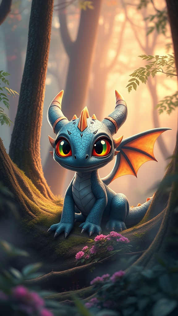 Chibi big-eyed Dragon nestled in an enchanting forest, full character concept with iridescent light hues, popular color palette, trending on art platforms, matte painting style, cinematic animation lighting, rich depth of field, finely detailed, rendered in Blender, aspect ratio 9:16, quality level 2, seed 300, version 5, influenced by Midjourney's style, exhibiting fluid and fractal dynamics, with a smokey and symmetrical appearance, in sharp focus with vibrant tones, enveloped in volumetric fog, studio lighting, depth perception enhanced, powered by Unreal Engine 5 and Octane Render with ray tracing, exuding a subtle Disney-esque art style, improved with slight creative alterations to maintain the core charm.