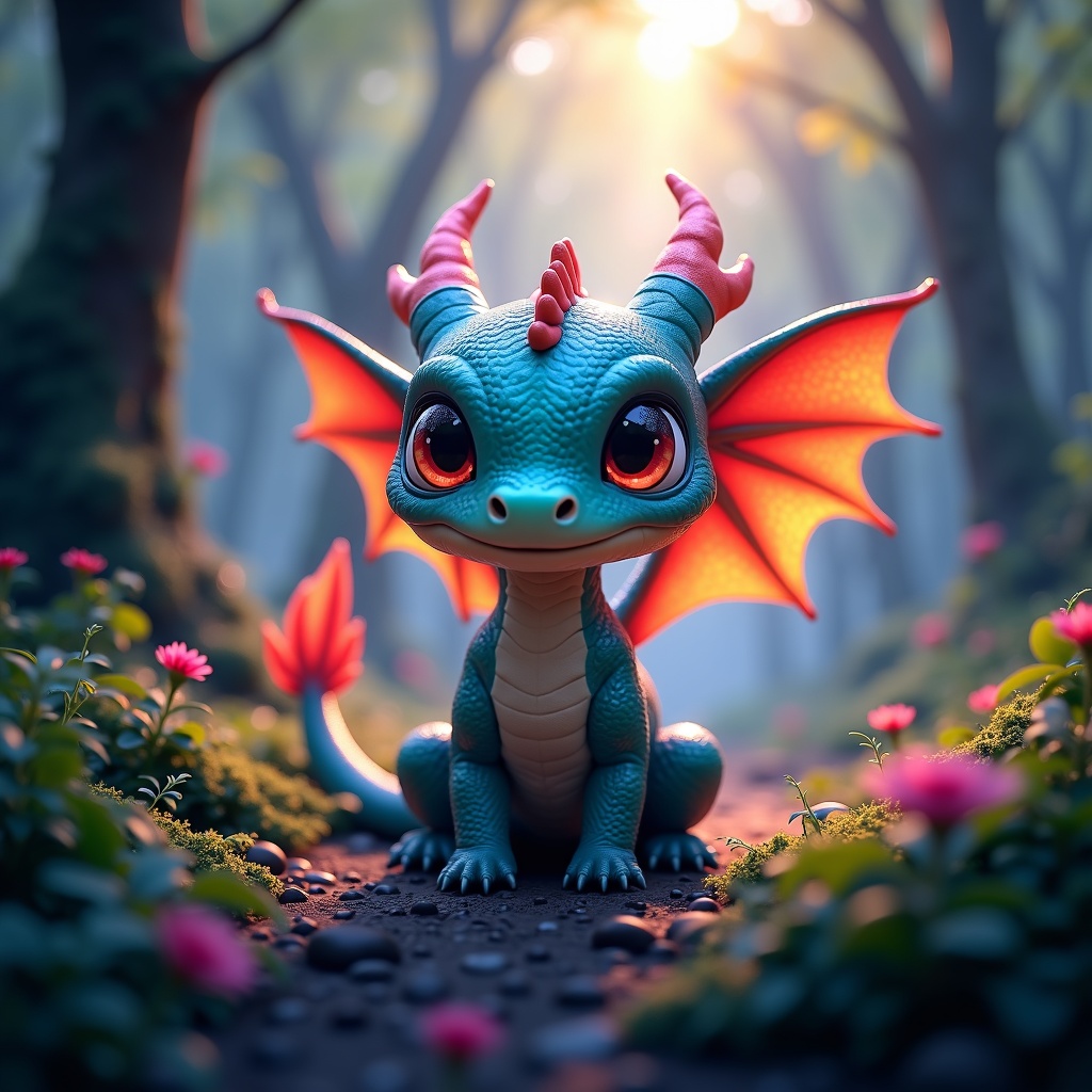 Chibi dragon with big eyes nestled in a lush forest, exhibiting a full character concept with iridescent and rainbow-hued light. Embracing a trending color palette, the scene is popular on artstation with a matte painting style. An emphasis on animation lighting and depth of field creates an ultra-detailed rendering using Blender. The composition presents turbulent fluidity, fractal elements, and smokey, symmetrical features in sharp focus, enhanced by vibrant and volumetric fog. Studio lighting with depth of field is used alongside Unreal Engine 5 and Octane Render technologies, showcasing raytracing in a Disney art style.