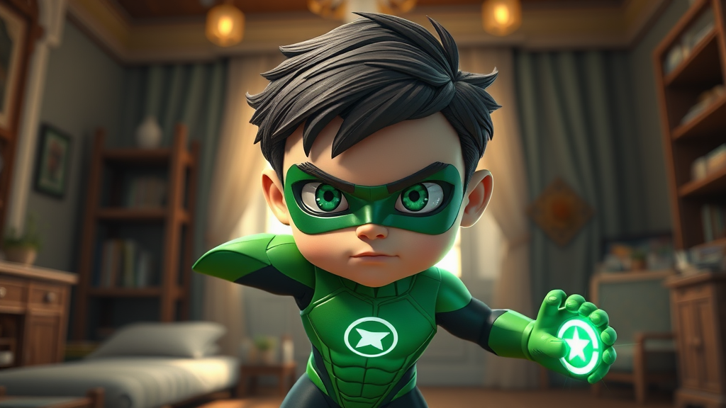 Chibi humanoid green lantern in an action-packed pose, inside a cozy room with soft lighting, rendered in Unreal Engine 5. The scene captures the charm of a Pixar and Hayao Miyazaki collaboration, showcasing meticulous detail typical of artstation digital paintings. The character is designed by Mark Redden, blending elements of surrealism with Octane renderings for a UHD, HDR, 8K visual experience. The image is clean and clear, avoiding artifacts, distortions, and extraneous elements like logos or text. Facial features are expressive and harmoniously balanced, avoiding any disfigurement or mutations, ensuring a captivating and delightful character design.
