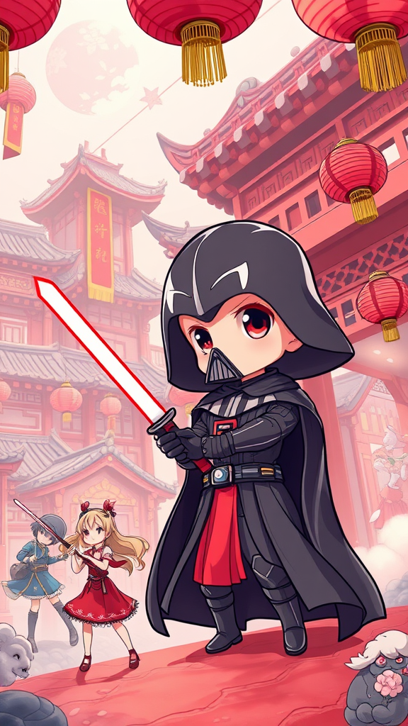 Chibi manga-inspired legend of Vader anime scene, infused with VH1 vibes, depicted in the ethereal style of Miho Hirano. Featuring dynamic, action-packed sequences reminiscent of Gaston Bussière, set against the vibrant backdrop of Chinese New Year festivities. Characters are charmingly illustrated in the distinctive manner of Ross Tran, with a color palette dominated by light red and bronze. The ambiance evokes a sense of wonder and lively energy, capturing the essence of playful adventure.