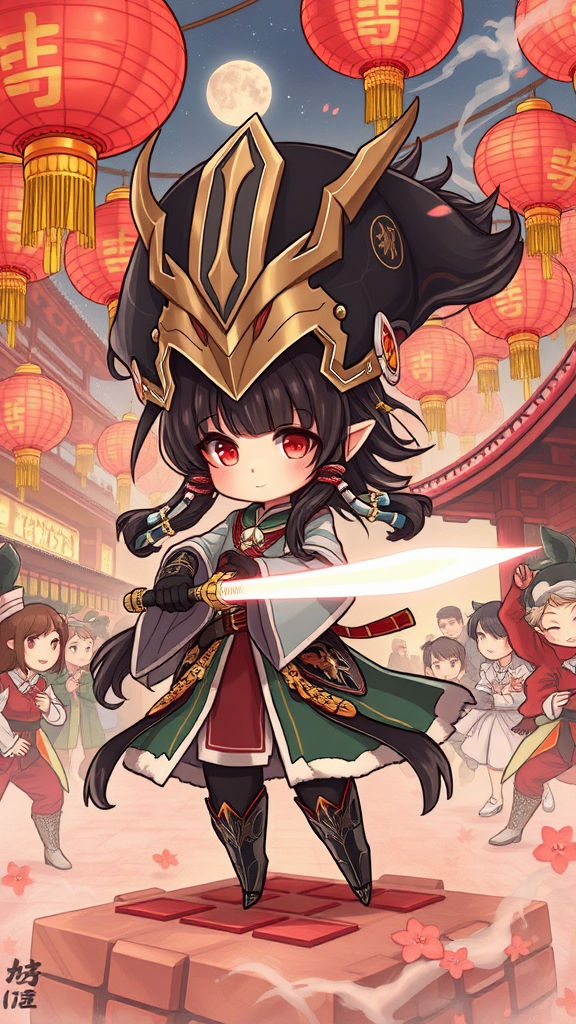Chibi manga legend of Vader anime, infused with the ethereal style of Miho Hirano and the dynamic, action-packed energy reminiscent of Gaston Bussière. Set against a backdrop of vibrant Chinese New Year festivities, with inspiration from Ross Tran's charming character illustrations. The scene is painted in hues of light red and bronze, capturing the essence of a mythical tale unfolding in a lively and enchanting atmosphere.