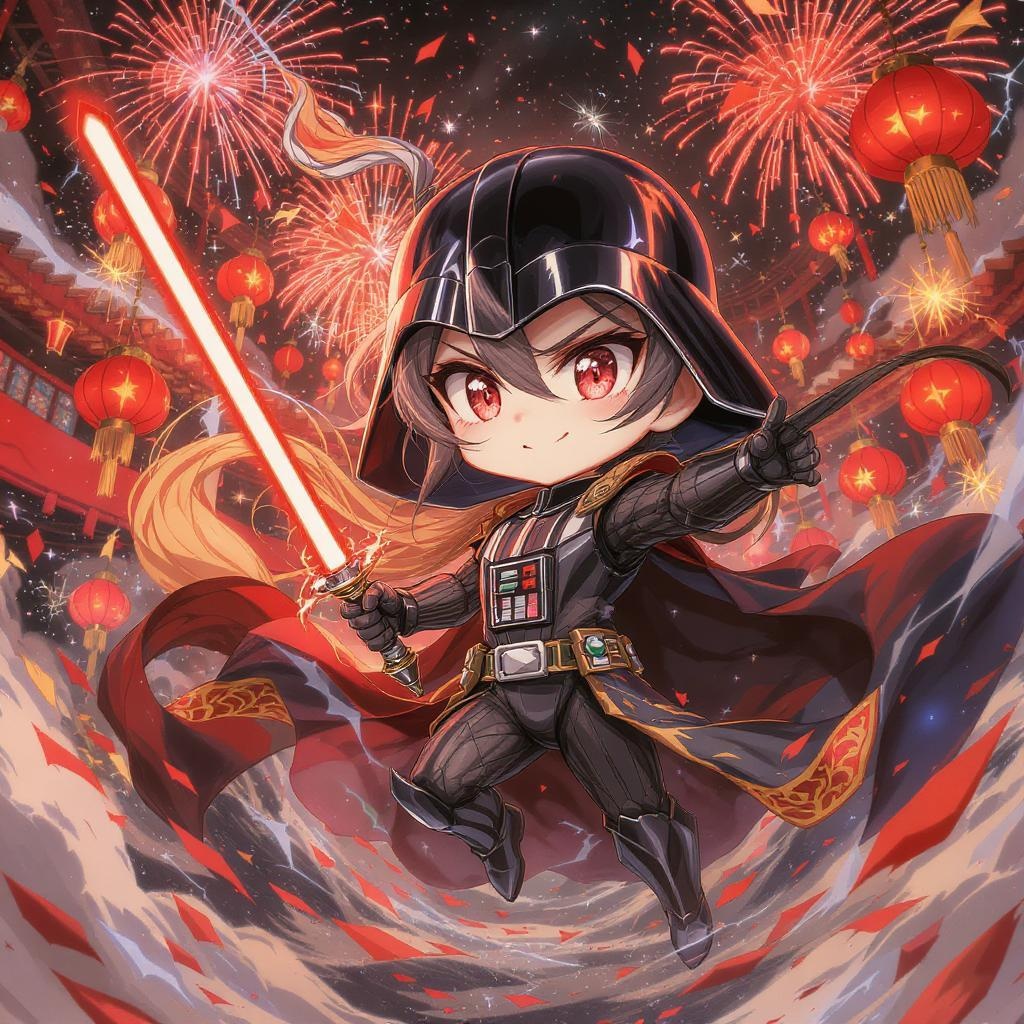 Chibi manga legend of Vader anime infused with VH1 style, featuring dynamic and action-packed scenes reminiscent of Miho Hirano's flowing elegance. Capture the enchanting charm of Gaston Bussière and incorporate vibrant Chinese New Year festivities flair. Evoke the lively spirit of Ross Tran with charming character illustrations adorned in light red and bronze hues, creating a captivating and whimsical atmosphere.