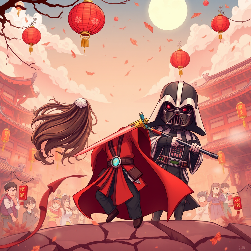 Chibi manga legend of Vader anime on VH1, inspired by Miho Hirano's ethereal style, with dynamic and action-packed scenes reminiscent of Gaston Bussière's intricate compositions. Set against the vibrant backdrop of Chinese New Year festivities, the artwork captures the essence of Ross Tran's modern charm with captivating character illustrations. Dominated by a palette of light red and bronze hues, the scenes unfold in a picturesque and enchanting world filled with creativity and wonder.