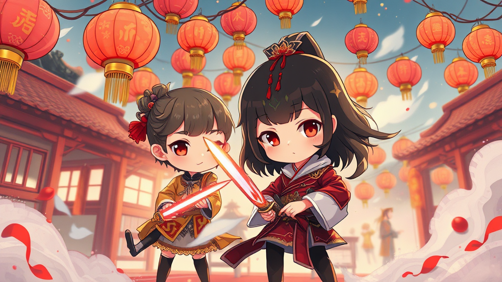 Chibi manga legend of Vader anime with VH1 influences, infusing the ethereal style of Miho Hirano, featuring dynamic, action-packed scenes reminiscent of Gaston Bussière. Set amidst the vibrant tapestry of Chinese New Year festivities, drawing on the enchanting charm of Ross Tran's character illustrations. The palette teems with light red and bronze tones, creating an atmosphere of warmth and excitement. Aspect ratio 73:88, maintaining high stylistic sensitivity.