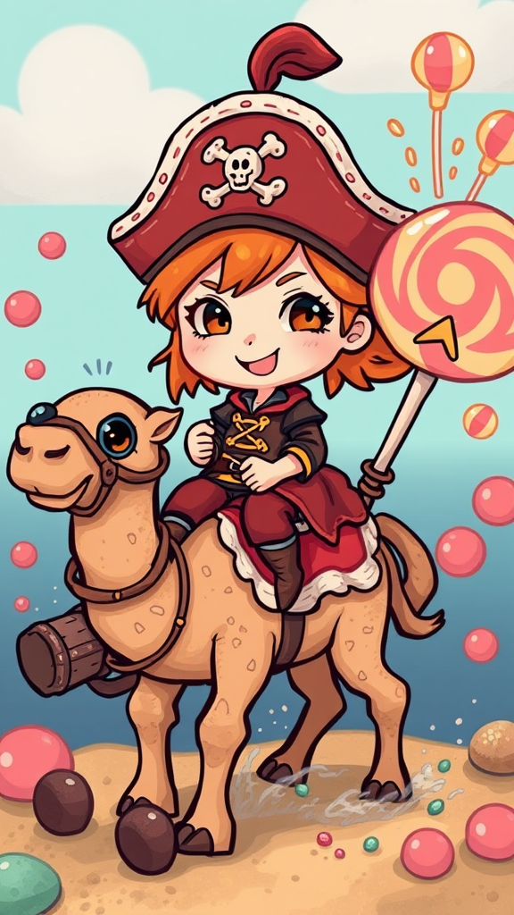 Chibi Pippi Longstocking pirate captain with a mischievous grin riding a miniature camel through a sugar cookie cannon that shoots gelatinous lollipop explosions.